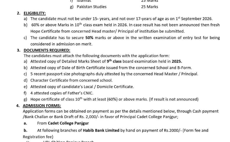 Limited number of seats are available in Cadet College Panjgur for admission in FSc. 1st Year Class (Pre-Medical / Pre-Engineering / ICS Groups). Interested candidates, who appeared in Matriculation annual examination 2026 are eligible to apply.
